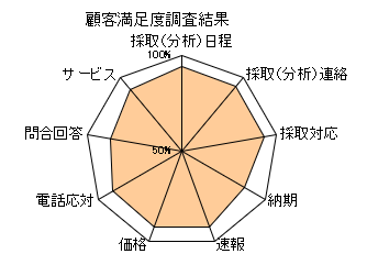 2026.04.23 お知らせ 2025年度の顧客満足度調査を行いました。 顧客満足度調査 〖2025年3月実施〗 【レーダーチャート】 【まとめ】 【考察】 全体的に、顧客満足度は高評価をいただけました。 顧客満足度調査にご回答くださった企業の皆様、 ご協力いただき、誠にありがとうございました。